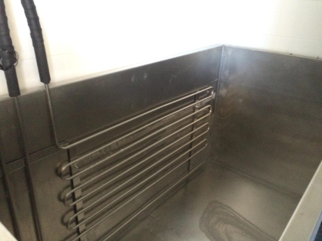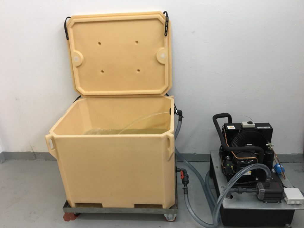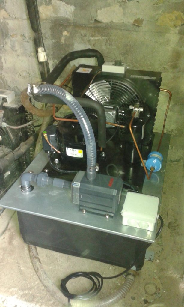 El equipo de refrigeración puede ser un equipo compacto con su serpentín y deposito plastificado, donde se refrigera la salmuera y por medido de una bomba de agua se manda al deposito de la salmuera.